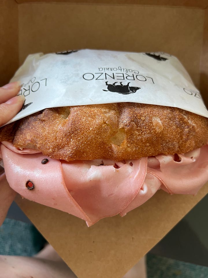 Lorenzo California (Beverly Hills) - Is Lorenzo a real person? Unlikely. It doesn’t matter. Lorenzo is a vibe. Lorenzo is a feeling. Lorenzo is channeling your inner older Italian man. I’ve been twice in one month, and I’m already pining to return. Seating is tough at the small yet welcoming pistachio green cafe on Santa Monica Blvd, but there’s great people watching as you wait for your order, and a large fancy park a couple blocks away for a picnic. The Florentine-style sandwiches are simple but substantial, all served on thin, light focaccia buns baked fresh daily from Bianca Bakery. I’ve tried the namesake Lorenzo (with “parmigiano pate”, basically a super thick spreadable parmesan cream condiment--amazing), the Salamino (loaded with marinated artichokes) and the Capriccio (adding mortadella is key here). They do serve a few pastas and salads, which also look amazing, but honestly I can’t imagine walking out of there without a stracciatella-laiden sammy in my paws.